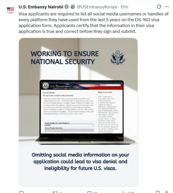 The U.S. Embassy in Kenya advises applicants to set their profiles to public for vetting purposes. This rule, introduced under tighter security measures in 2019, is now strictly enforced due to global security concerns and visa backlogs after the pandemic.