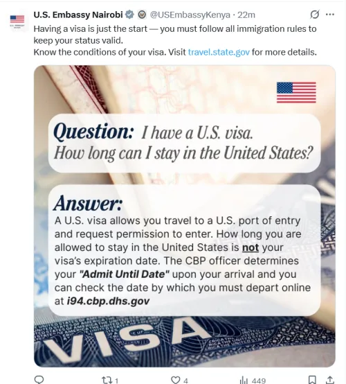 On August 13, 2025, the Embassy warned Kenyan students on F and M visas that skipping classes or leaving school without notifying the institution could lead to visa revocation.