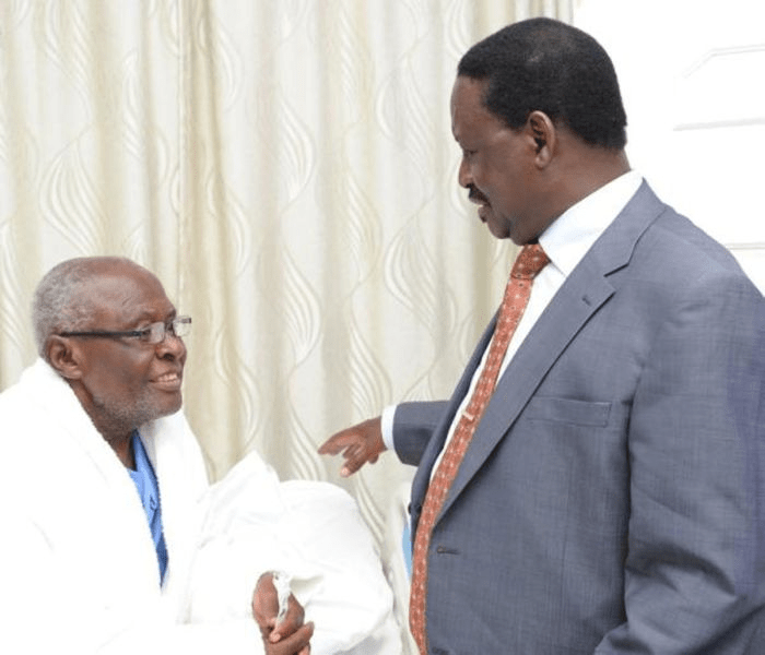 ODM leader Raila Odinga (right) visits the late Martin Shikuku at a hospital in Nairobiย