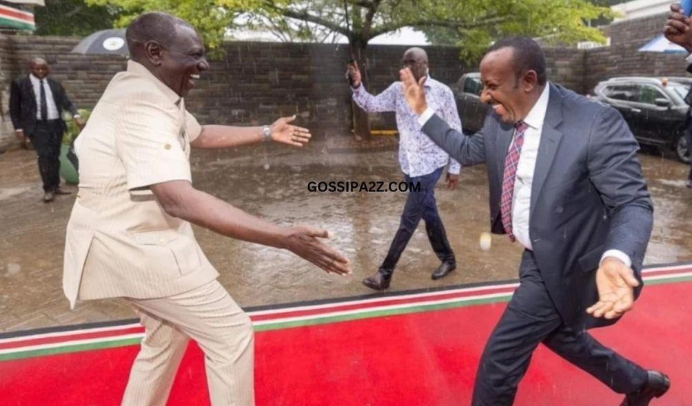 Arriving in Kenya on a rainy Tuesday, the Ethiopian leader was captured in a photo attempting to shake hands with Ruto. Despite the downpour, both leaders looked cheerful, sporting broad smiles as they extended their arms towards each other.