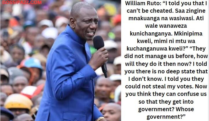 “I told you( Kenyans) that I can’t be cheated. Saa zingine mnakuanga na wasiwasi. Ati wale wanaweza kunichanganya. Mkinipima kweli, mimi ni mtu wa kuchanganuwa kweli?” Ruto posed.